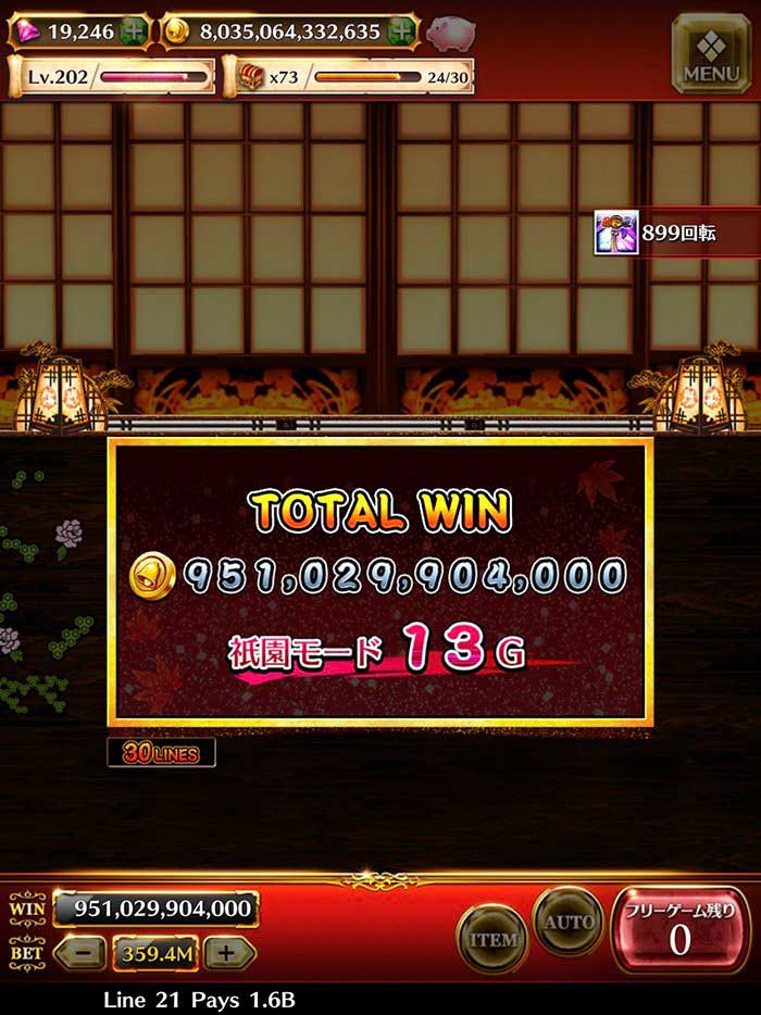 イベント期間内のMAX BETに設定して、直撃券をドーン!! 祇園モードに入れて景気づけの大量コイン獲得を目指すってわけよ。
