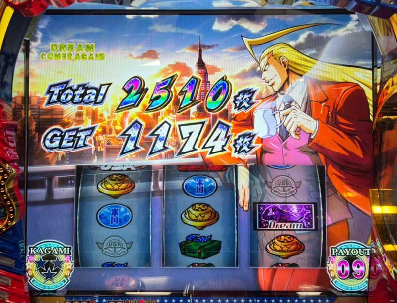 高設定は一撃で大量上乗せできなくても細かく当たり続けて獲得枚数1000枚超え、からの「ドリームカムズアゲイン」突入っていうのが狙いやすそう!!!