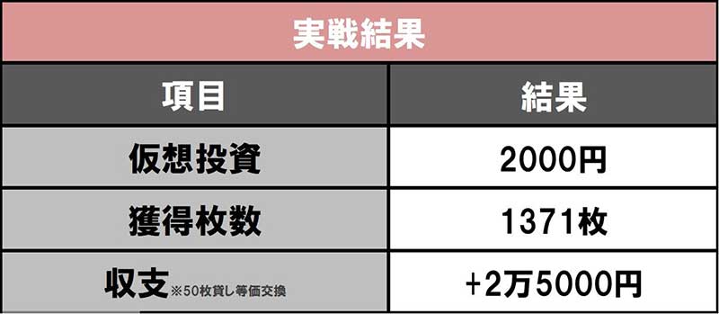 AT1回あたりの出玉は伸び悩みましたが、超優秀な初当りのおかげで差枚数は満足感のあるプラスとなりました。これだけ初当りが軽ければ、確定演出に頼らずともホールで粘ることができそうです。