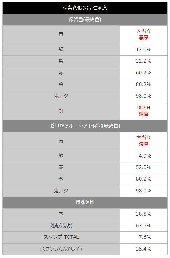 保留変化の信頼度は、緑で約12.0%、紫で約32.2%とチャンスが始まり、赤保留まで昇格すれば約60.2%、金保留なら約80.2%と激アツ!さらに、おなじみの「鬼アツ」柄なら約98.0%と、ほぼ大当たりを確信できるレベルに仕上がっています。また、ユニークな「ゼロからルーレット保留」も搭載されており、こちらの赤も約52.0%と期待大です。