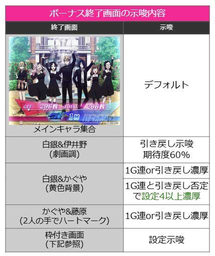 本機のボーナス終了画面は、大きく分けて「枠なし」と「枠付き」の2パターンが存在します。まず枠なし画面ですが、メインキャラ集合はデフォルト。それ以外が出現すればチャンス到来です! 劇画調の「白銀&伊井野」は引き戻し期待度約60%、「かぐや&藤原(手でハートマーク)」は1G連または引き戻し濃厚となります。さらに黄色背景の「白銀&かぐや」は非常に強力で、1G連や引き戻しが濃厚となるだけでなく、もしこれらを否定した場合は設定4以上が確定するという嬉しい法則も存在します。ただし、これらの特殊画面の出現率はそれぞれ約1%とレアなので、見逃し厳禁です!
