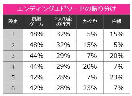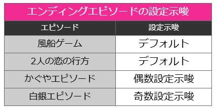 ただし、1G連ストックやエクストラボーナスで大量上乗せをした状態でエンディングを迎えると「2人の恋の行方エピソード」が優先して発生。この場合は示唆が上書きされる点に注意しましょう。