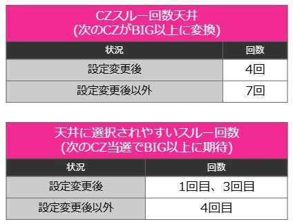 ボーナス間でのCZ失敗が続いても、最大7回でスルー回数天井に到達します。8回目のCZ当選時にBIG以上へ変換されるため、スルーが続いている台は打つ価値があります。