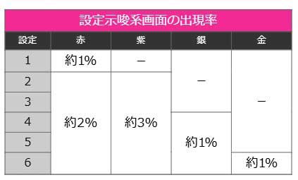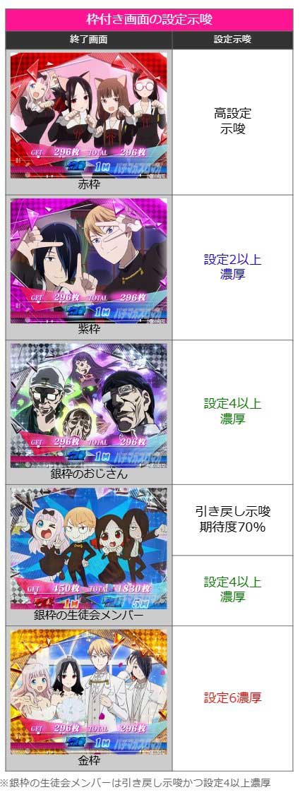 続いて設定推測の要となるのが「枠付き画面」です。赤枠なら高設定の期待度がアップし、紫枠が出現すれば設定2以上が濃厚となります。さらに銀枠は2種類あり、おじさんなら設定4以上が濃厚、生徒会メンバーなら設定4以上に加え引き戻し期待度も約70%まで跳ね上がります。そして最高峰の金枠が出現すれば、最高設定である設定6が濃厚という至福の瞬間が訪れます!出現率は赤が1~2%、紫が3%、銀や金が各1%程度となっています。