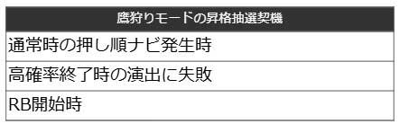 注目すべきは、このモードが一度上がると「鷹狩り」に当選するまで転落しないという点です。昇格の契機は、通常時の押し順ナビ発生時や、高確率演出に失敗したとき、そしてREG開始時など多岐にわたります。地道な積み重ねが、後の大チャンスを連れてきてくれる仕様となっています。