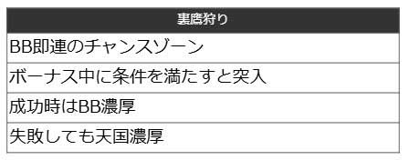 BB中にストックを2個以上獲得した際や、有利区間のリセット時には裏鷹狩りへと突入する。ここでの演出に成功すればBB当選が濃厚となるだけでなく、裏鷹狩り自体がループする仕組みだ。