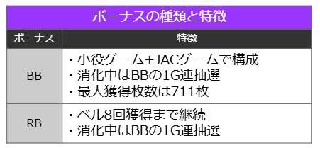 ボーナスはBBとRBの2種類が存在し、いずれも擬似ボーナスだ。BBは小役ゲームとJACゲームの構成で、4号機の吉宗を彷彿とさせる最大711枚の獲得が可能となっている。