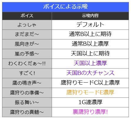 注目すべきはモード示唆だけではありません。本機独自の特殊状態である「鷹狩りモード」を示唆するボイスも存在します。「鷹の鳴き声~」は鷹狩りモードC以上が濃厚、「鷹狩りの準備~」なら上位のモードEが濃厚となります。