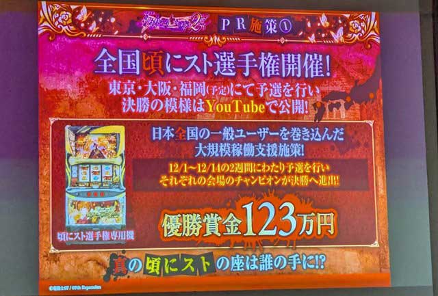 また、プロモーションの一環として「全国頃にスト選手権」の開催も発表された。これは優勝賞金123万円という大規模な大会であり、東日本5店舗、西日本6店舗に設置される専用筐体でスコアを競い合う形式となっている。