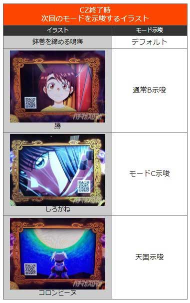 「機械仕掛けの神、幕間チャンス、運命の一劇」終了時にPUSHボタンを押すとモード示唆のイラストが出現する。
