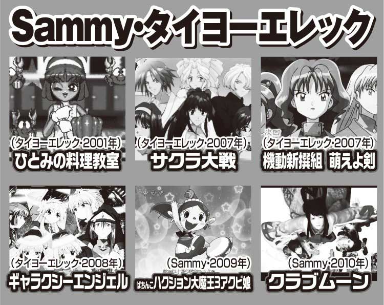 サクラ大戦は2作品、萌えよ剣は3作品パチンコ化。タイヨーエレックの萌え台には「かえで」というヒロインが活躍する「伝説の巫女」も存在。