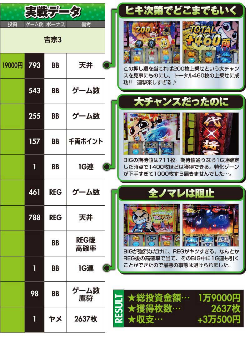 最後まで吉宗を打ち続けた結果は2500枚超の出玉を獲得。BIGを引けた時が楽しすぎる。途中2連続でREGだった時はお昼ご飯が口から出そうになりましたが、そのうち1回はREG後の高確率で当たってくれたのでなんとか出さずに済みました。設定示唆らしき画面はないけれどグラフは右肩上がり。低設定ではないかもしれないですね。