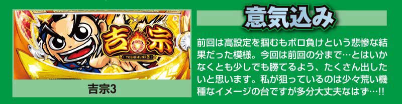 ちなみに、私が押さえたのは新台の「吉宗3」。新台初日なので設定推測などの詳細は出ていませんが、BIGを引ければ期待値711枚と楽しそうな台なのは間違いない。とにかくBIGを引くことに専念して頑張ります。