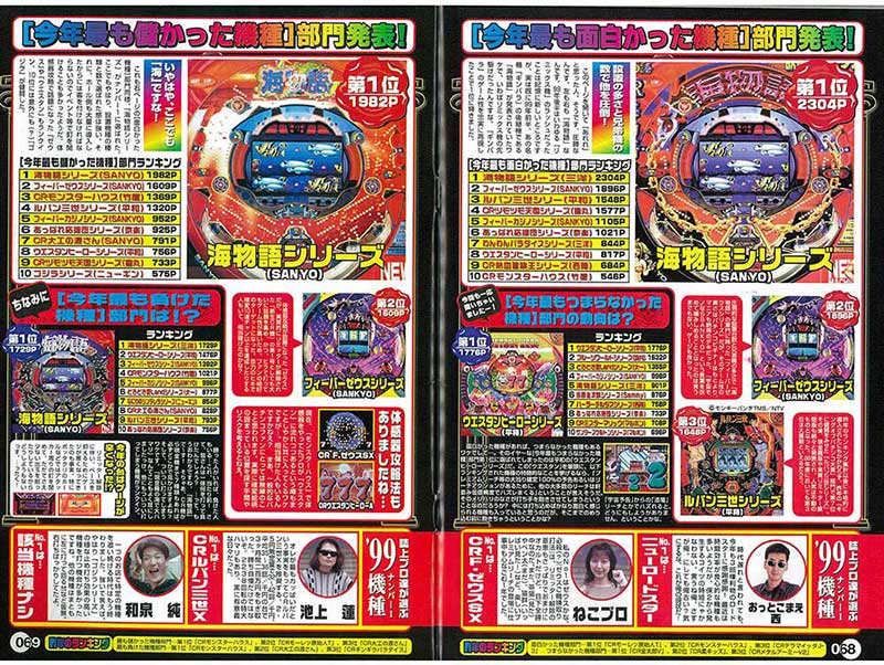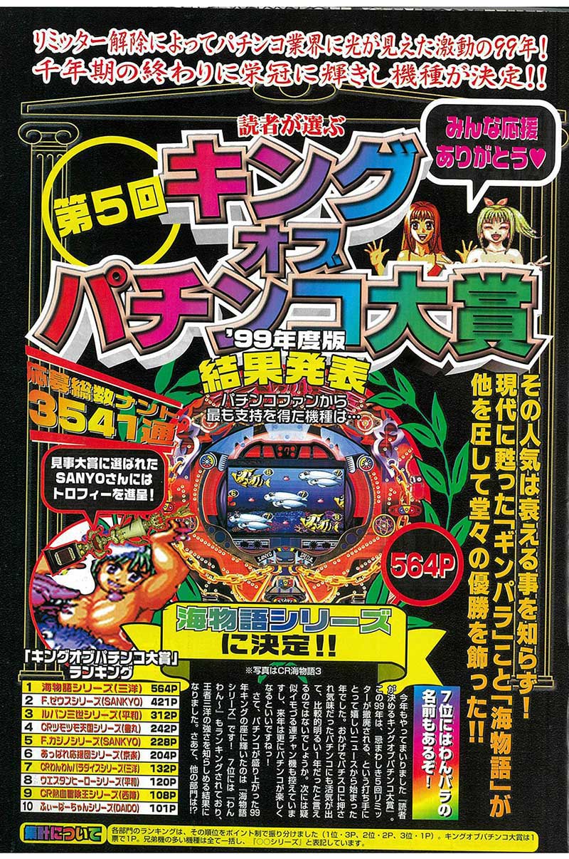 前年まで搭載されていた5回リミッターが撤廃された記念すべき年。その栄冠に輝いたのは「海物語」! ここから続々と人気シリーズ機が作られていくその元祖は、この年に初登場となりました。ちなみに「海物語」の前身機にあたる「ギンギラパラダイス」は第1回キングオブパチンコ大賞で2位となった後、第3回までベスト10内にランクインし続けた超人気マシンでした。