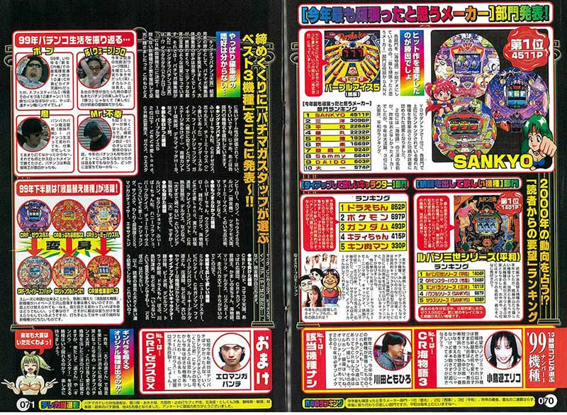 となれば「頑張ったと思うメーカー」も1位は三洋…と思いきや、ここはSANKYOが奪取! ヒット作を連発したという部分が評価されての戴冠となりました。ちなみにここで注目して欲しいのが「タイアップして欲しいキャラクター」部門。本文中まで読み込んでみると、本当にタイアップ機として登場したモチーフの多いこと。この年から約20年で現実のものになるとは…当時はまったく想像できませんでした!