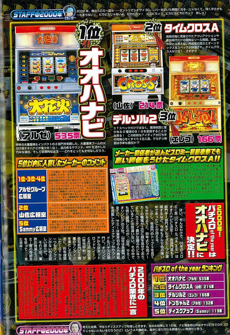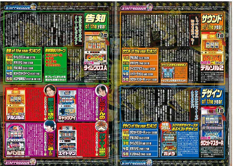 この年は第1回と異なり部門賞は「サウンド」「デザイン」「告知」の3種類に。そしてそれぞれには納得の機種が収まった形となりました。中でも特に気になるのが「告知」部門1位の「タイムクロスA」。この頃から液晶搭載機が爆発的に増えていくのですがその初期において、その液晶演出の美麗さ・おもしろさを評価された点はさすがといえるでしょう。また前年1位「アステカ」を彷彿とさせる「デルソル2」が、この年も高い人気を得ている点にも注目です!