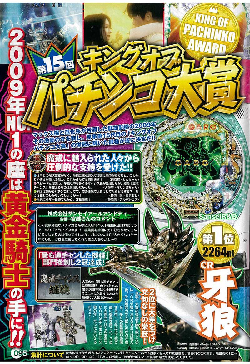 「慶次 斬」「エヴァ 最後のシ者」「地中海」といったパチンコ大賞常連のシリーズ機を完全に押さえ、新勢力としてランキング内に突如登場したのが「CR牙狼」! 前年末の登場ながらも1年を通して高い稼働と人気を誇り、文句なしのパチンコ大賞獲得となりました。正直導入当初の話題性はそれほどではなかったものの、連チャンへの期待感とその爆発力、そこにモチーフの魅力が広まっていくにつれ爆上がり! 見事、第15回の大賞機種となりました。