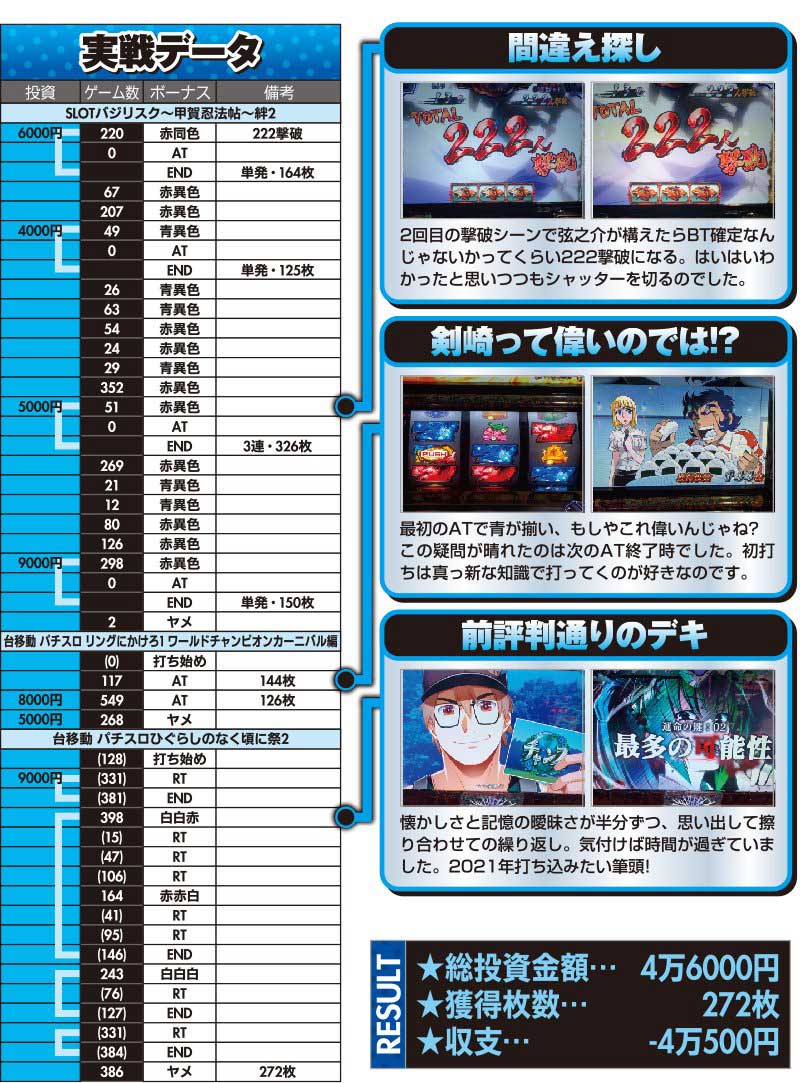 さて、リンかけは初当りを2回とるも本機の長所とも言える自力感は体験できず。評価は保留としましょうか…、というかだし方わからんかった。そして、触りたかったひぐらしは想像以上のデキに感動。もう完全に前作のひぐらしだし6号機だということを忘れてしまうほどだった。2021年は「6号機にしては」という枕詞のつかない名機が生まれそうな予感ですよ。同じビタでも前作よりも目押しがし易くなっているのもありがたい。