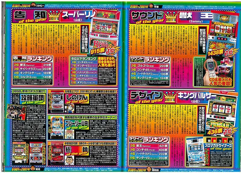 「サウンド」「デザイン」「告知」の3部門は前年同様、異なる機種がそれぞれ1位を獲得しました。また2位以下はどの部門でも混戦となっており、この年の機種がどの部門においても優秀だったことがわかります。逆に各所にあるカコミ記事内にはマニアックな機種が多数登場。この年の機種がいかに多彩だったのか見て取れます!