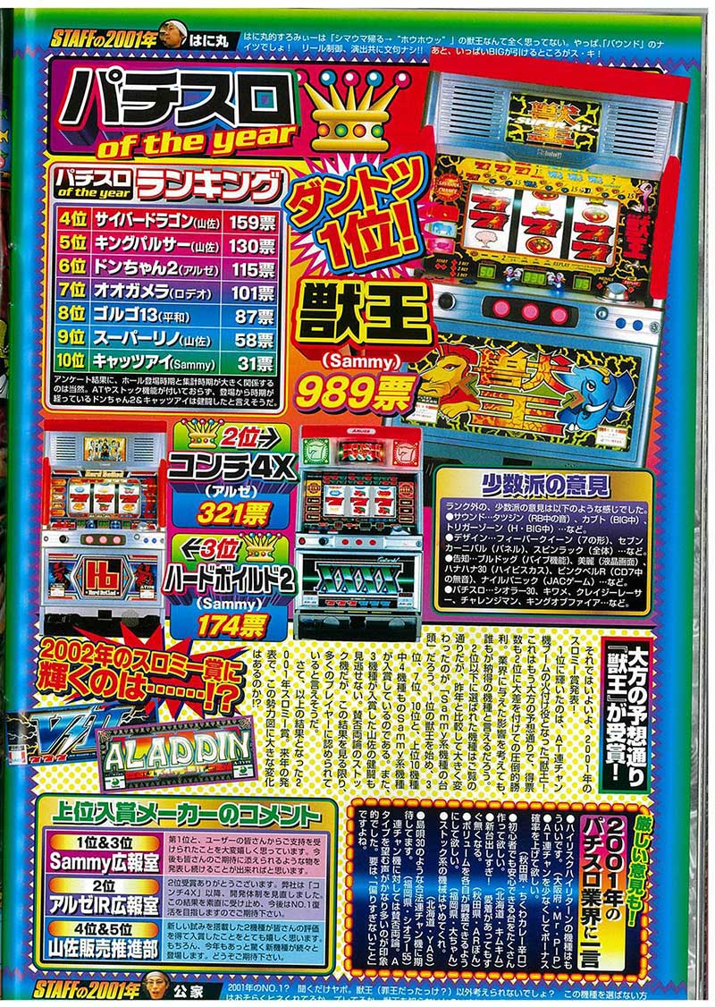 部門賞は混戦だったものの大賞の方は蓋を開けてみれば「獣王」が圧勝! 当時のホールの様子を知っている人からすればこの結果は当然といえるものでしょう。この年から主流の1つとなるAT連チャンの火付け役なことに加え、秀逸なドット演出に期待感高まるBGMとあらゆるポイントが高評価となりました。また「アステカ」「大花火」と続いてきた大賞機種がここにきて、ガラリとゲーム性が変化した点も注目です!