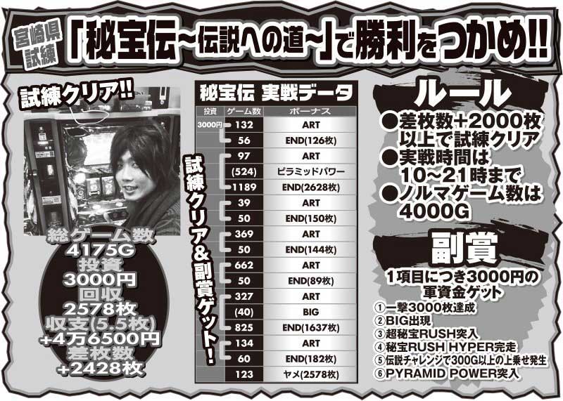 しかし、この日6回目のART中にBIGが当たるなど一撃約1600枚獲得。そして、ここから少し回して、ノルマゲーム数に到達しました。差枚数プラス2千枚オーバーで試練クリア!さらに副賞のBIG・ピラミッドパワーを引き、軍資金もゲット。試練クリア+副賞と、大満足な結果になりました。