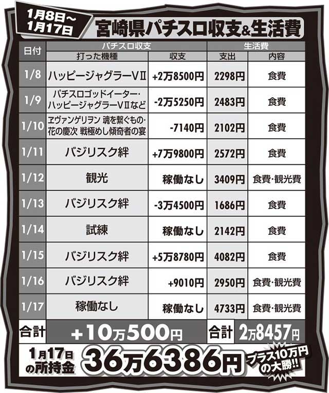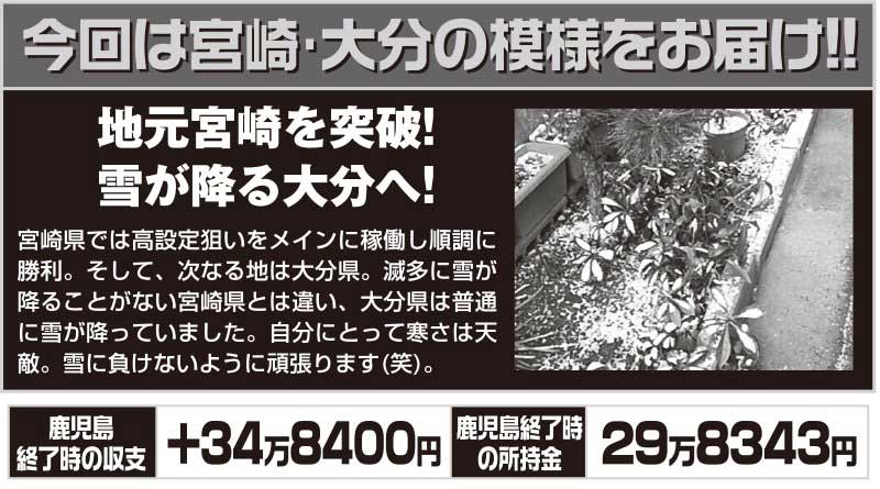 鹿児島県を突破して次なる場所は地元「宮崎県」。宮崎には知り合いの専業が数人いるのですが、みんな口を揃えて「ここは厳しい地域」と言います。以前、自分が打っていた頃も簡単には勝てない場所だったことを覚えています。しかし、厳しい地域でも結果を残さなければならないのが旅打ち。「絶対勝つ」と気合を入れて乗り込みました。