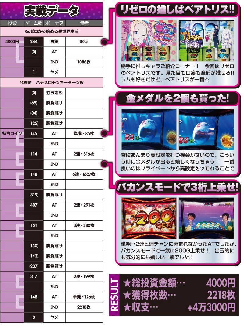 朝イチのリゼロに始まって、台移動したモンキーターンⅣまで全てがうまくいった一日でした! 誰かの横で打つのは知識も補ってもらえるし、何より楽しいから立ち回りとしてはいいのでは…!? これは次回からもアリかも!!