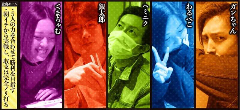 スロマガが誇る精鋭ライター6人のうち5人が実戦に参加。同一ホール内にて朝イチから実戦し、完全ノリ打ちでの収支プラスを目指す。はたして6人の実力はどれほどか…!?