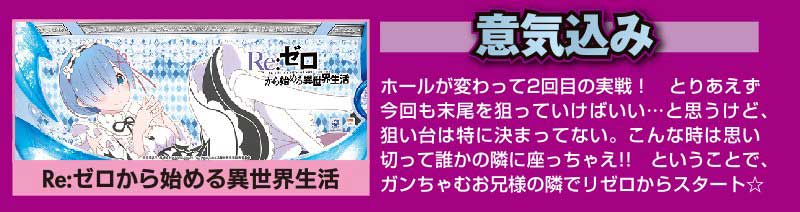 とりあえず誰かの隣、と選んだリゼロは早めのヒットからしっかり白鯨攻略戦を成功させてATへ! なんと投資はたったの4千円、出玉は1000枚ちょっと! 朝から良い感じ!! ただ、ガンちゃむお兄様曰く設定的にはなさそうということなので、その出玉だけ頂いてすぐに台移動です。