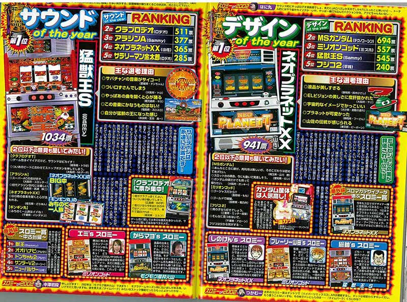 そして映えある大賞に選ばれたのは部門2冠の「ネオプラ」を押さえた「猛獣王」! 前年の「獣王」からシリーズ機での大賞連覇となりました。そして要注目なのが第2位。ここにはなんと神マシンの元祖である「ミリオンゴッド」がランクイン。好き嫌いが激しくわかれるゲーム性ながらも、その魅力は誰もが納得といった感じでしょうか。全体的には一撃系マシンと安定のAタイプマシンが両立した感じのランキングとなりました!