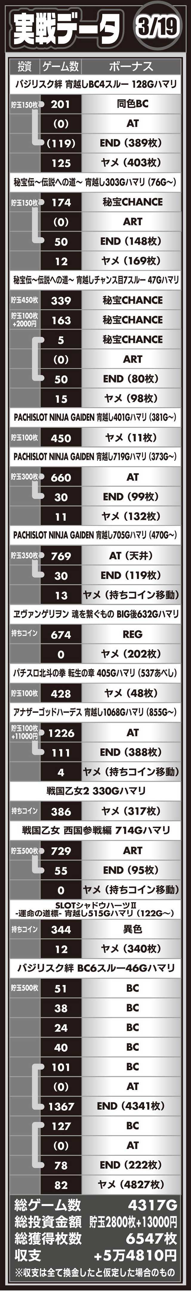 この日のデータでも打っているパチスロニンジャガイデンは、かなりハイエナ向き。内部ゲーム数が200G・400G・600GでNMモード4に移行するので、ほぼ同ゲーム数でステージチェンジが発生します。リセットor据え置きが見抜けるので、役に立ちます。