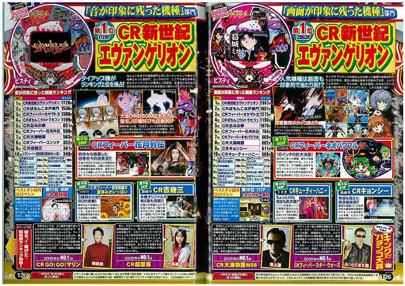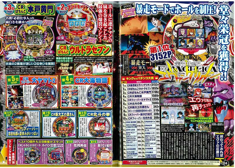 2006年のパチンコ大賞は今現在もシリーズ機がホールで活躍中の初代マシン、「CRエヴァンゲリオン」が受賞! 暴走モードという名で突然確変を広めただけでなく、原作に寄り添った演出、さらには新たなファン層を獲得した功績などすべてにおいて文句なしの選出となりました。さらに2位・3位には京楽マシンがランクイン。ここまで1位を取り切れていませんが、確実に京楽マシン人気が高まっていることを感じられる順位となっています。