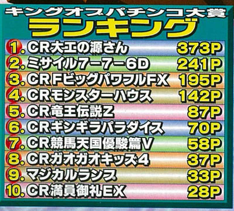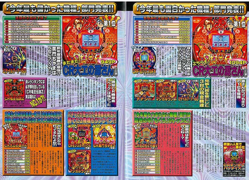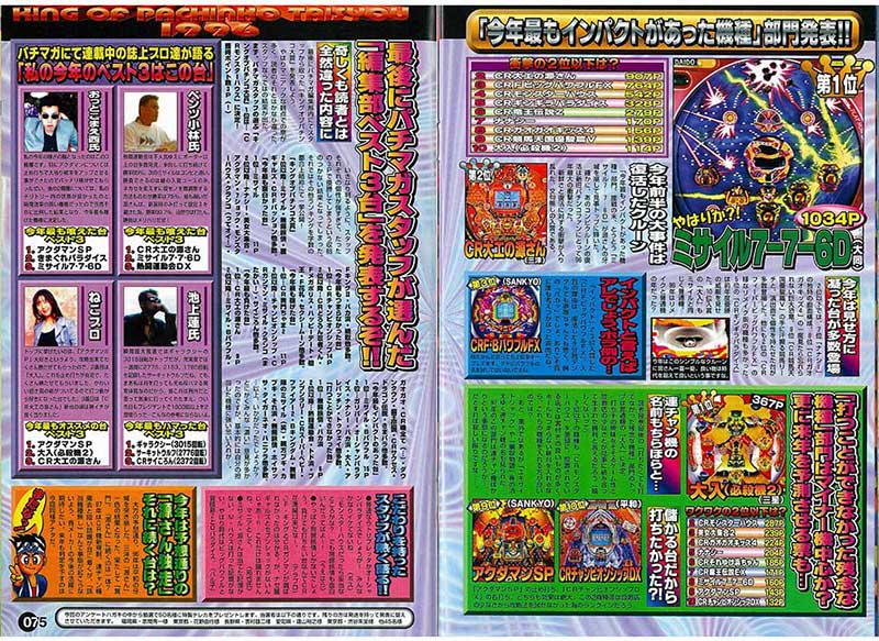 当時はCR全盛期ということもありランキング内に8機種がランクイン。そんな中で異彩を放っているのが「ミサイル7-7-6D」。液晶非搭載ながら一撃4千発の威力とクルーンによるゲーム性にハマる人が続出! プロたちも稼げる機種として挙げる人が多い人気マシンとなりました。