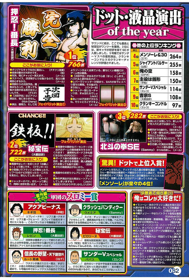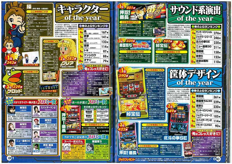 部門賞は前年まで全3部門でしたが、この年から4つに増えその対象も一新! 「サウンド」「筐体デザイン」「キャラクター」「ドット・液晶」の4部門それぞれに投票してもらえる形となりました。そんな各部門の初代1位は上記の通り! 前年大賞の「押忍!番長」は「サウンド」「キャラクター」「ドット・液晶」の3部門で1位を獲得。唯一「筐体デザイン」では「秘宝伝」が1位となりましたが、最終的には「大都技研」マシンが首位を独占することになりました。これも4号機~5号機の過渡期ならではの結果といえるでしょう。