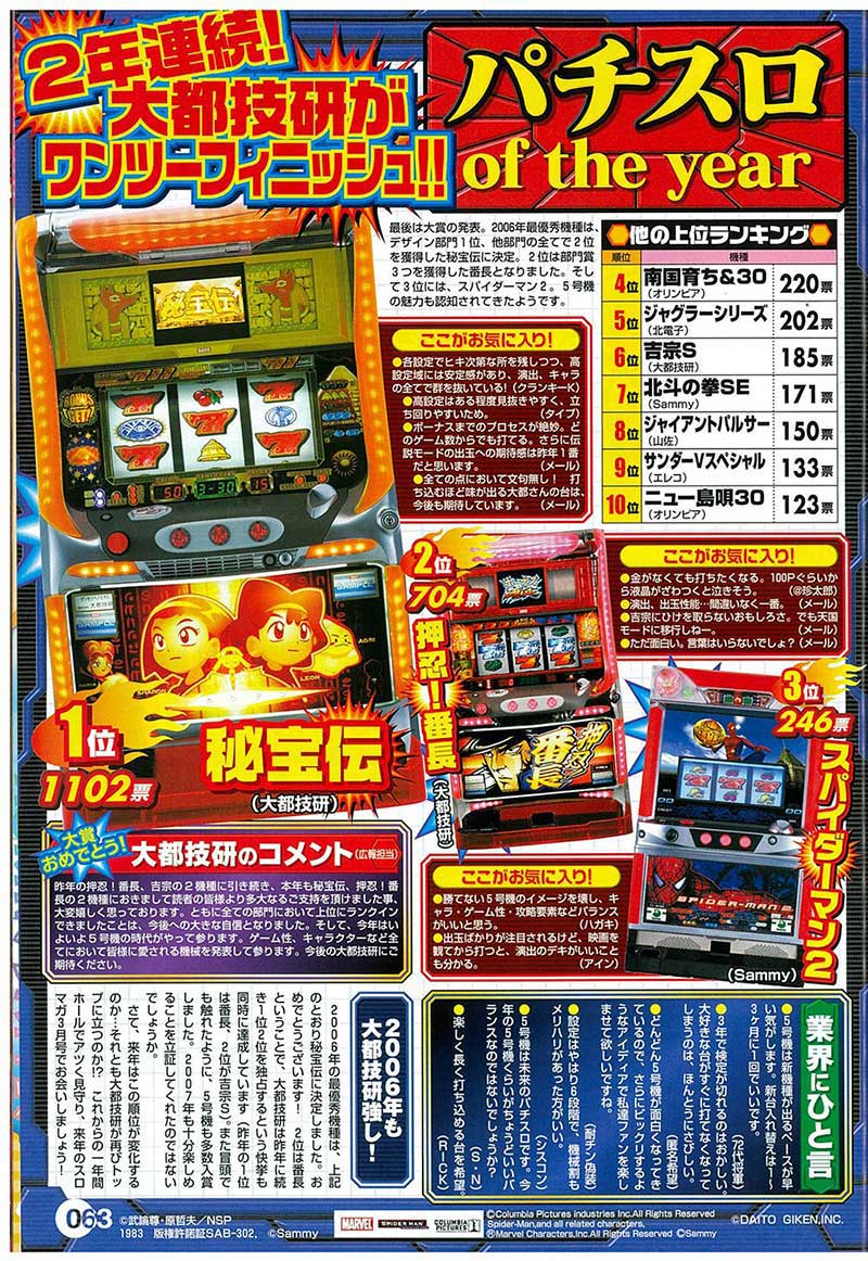 4号機の最後の超人気マシンともいえる前年大賞機種「押忍!番長」は第2位。そんな機種をおさえてこの年大賞となったのは…「秘宝伝」!前年に引き続き「大都技研」のマシンのワンツーフィニッシュとなりました。3位には勝てないというウワサが多かった中、5号機のイメージを一新した「スパイダーマン2」がランクイン! 4位以下も同様の結果となっており、全体的には2006年を象徴したようなランキングとなりました。
