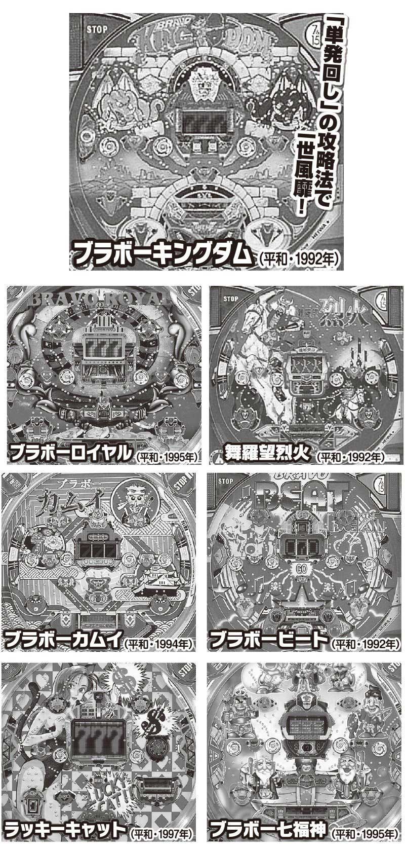 連チャンシステムに天国&地獄モードという新たな概念をもたらした「ブラボーキングダム」は、その強力な攻略法で一般週刊誌も特集を組むほどの大ヒットに。「舞羅望烈火」は完全単発回しでリーチがかかれば大当りした保留連チャン機。
