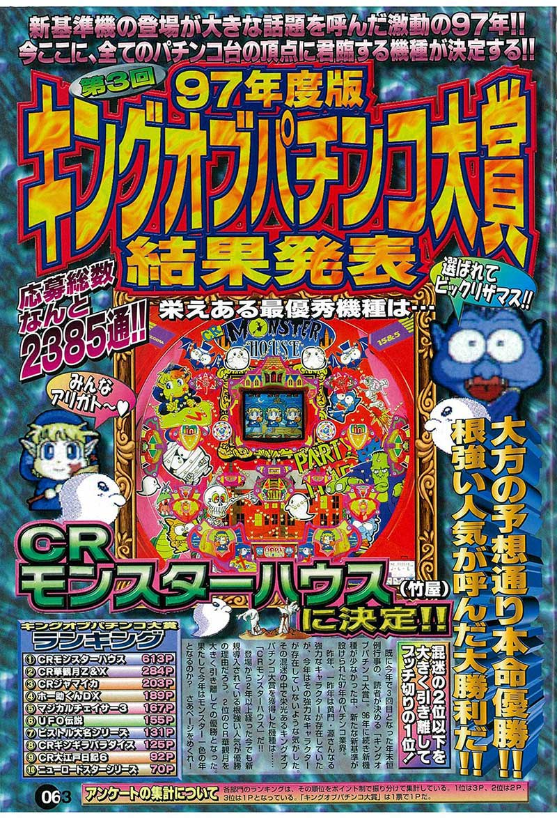 1998年の優勝は圧倒的大差をつけて「モンスターハウス」! その後もシリーズ機が多数作られているのでこれらのキャラクターを見たことがある人も多いハズだ。ちなみに本機のホール登場は1996年で、根強い人気を活かしての優勝ということになります。