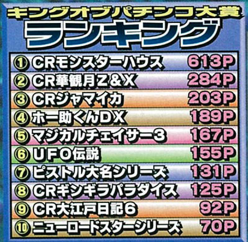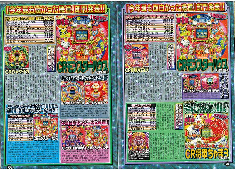 このページのランキングも「モンスターハウス」が独占! 圧倒的な大賞機種となっただけあり、他部門でも大差をつけています。逆にいえばこの年は本機以外に特筆すべき機種が出なかったという言い方も…。「儲かった機種」部門では「止め打ち」のワードが登場。この頃から攻略法の中心が「止め打ち」へと変遷していくことになります。