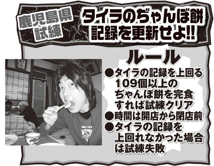鹿児島県の試練はぢゃんぼ餅の大食いです。これは2本の串に刺さった一口大のお餅。自分は小食で大食いは苦手な方。しかし、制限時間は約9時間と長め。これだけ時間があれば大丈夫だろうと考えながら試練へ。後々この考えが甘かったことを痛感しました。