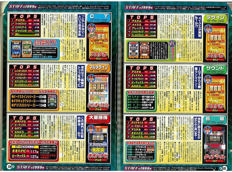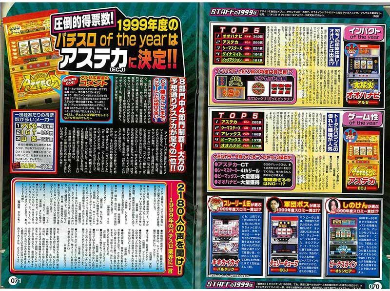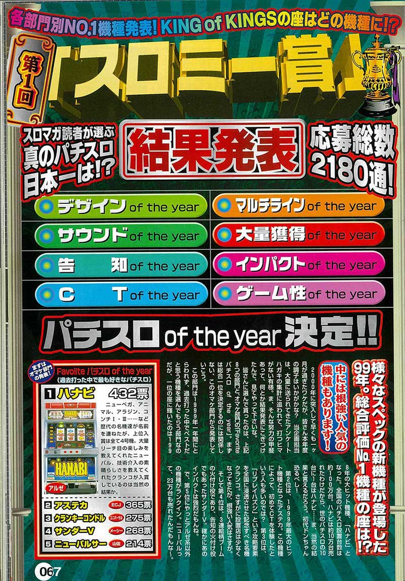 年末恒例の誌面企画といえばパチマガの「キングオブパチンコ大賞」とスロマガの「スロミー賞」。その「スロミー賞」の第1回となるのがこの2000年3月号の記事。大賞となる「パチスロof the year」の他、8つの部門賞が設けられているのが特徴です。