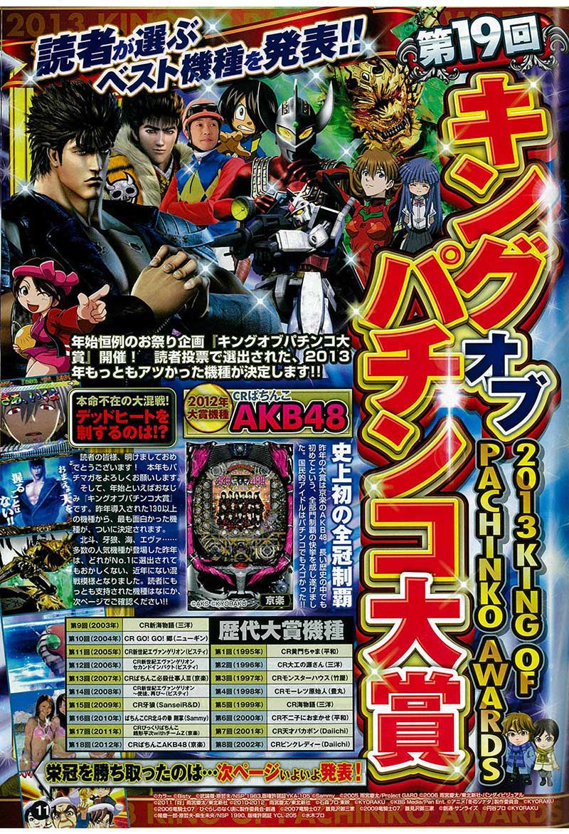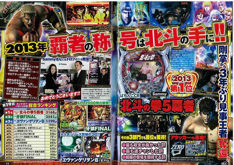 京楽マシン一色で染め上がった前年のキングオブパチンコ大賞。それを受けての打倒京楽マシンという流れからか、この年は3位までのランキングをパチンコ大賞常連機種が独占! その中で見事「北斗の拳5覇者」が首位となりました。「北斗」のシリーズ機が大賞となるのは3年ぶりのこと。それまでも上位にはランクインしており、今回、満を持しての受賞となりました。また2位には「牙狼FINAL」3位には「ヱヴァ8」とこちらも4位の京楽マシン「仮面ライダーV3」より上位に入賞。各メーカーの熾烈な争いが見て取れる結果となりました。