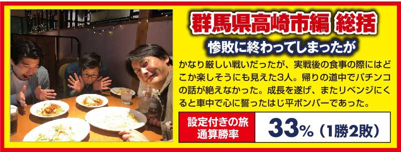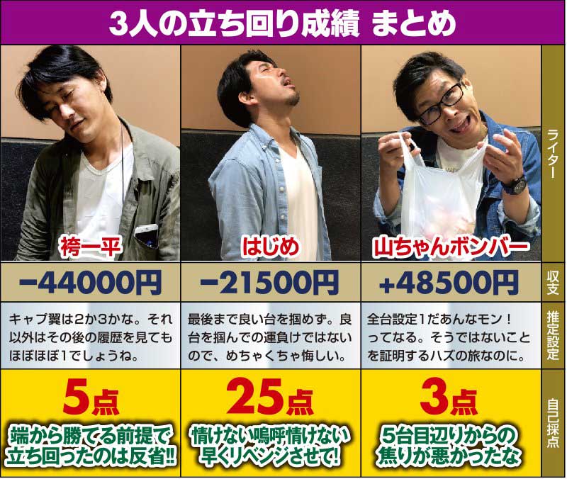 リベンジに燃える3人は今回の反省を活かし、すでに次回の「設定付きの旅」に対策を考えたようだ。3人は「次はパチンコ店が密集する地域」に標準を合わせると語る。必ずや、近日「はじ平ボンバー」がパチマガファンの前に現れるので、今後のパチマガ設定付き特集に注目して欲しい!
