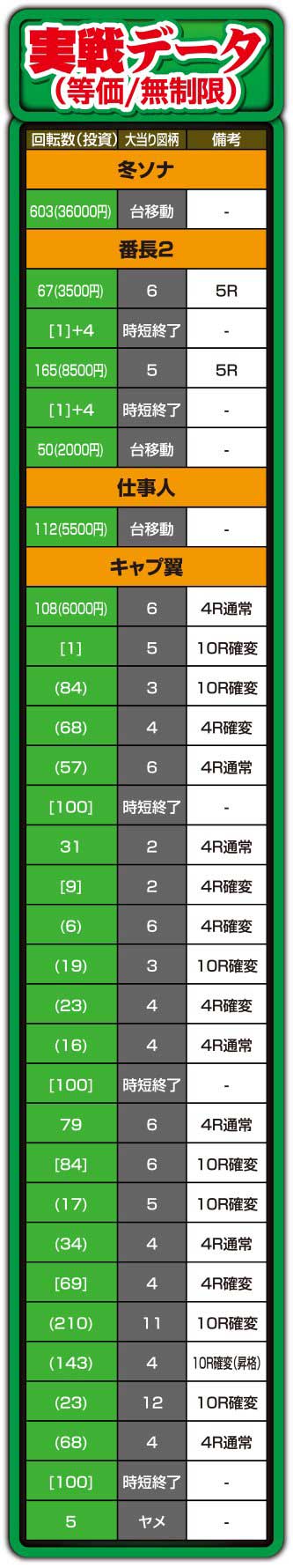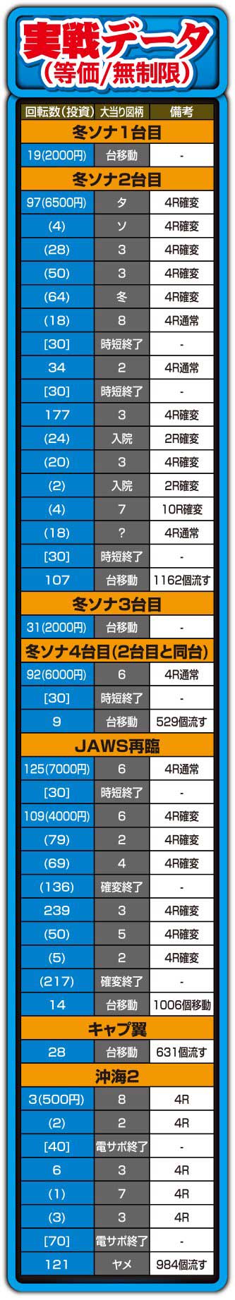 設定付きで最も設置の多かったのが冬ソナ。当然設定にも期待が持てそうと早速打ち始めたら…当たらん。通常時の設定推測要素が悪くないため粘ったけど結局ダメ。設定1の6倍以上ハマった。