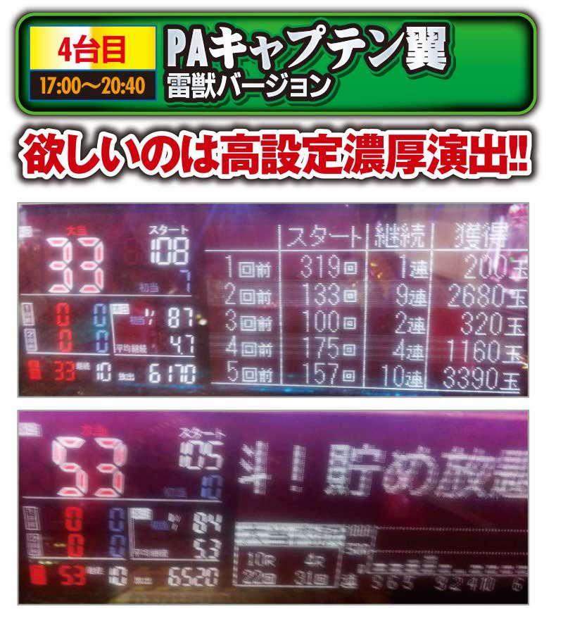 仕事人を粘るか迷っていたら、本日導入されたキャプテン翼が良さそうな履歴。スペック的に大量出玉は狙えないけど、設定を使っているのかを確認したくて移動。初当りも軽く高設定アピールが凄まじかったけど設定示唆は皆無。高設定濃厚とか出たら報われたのに。