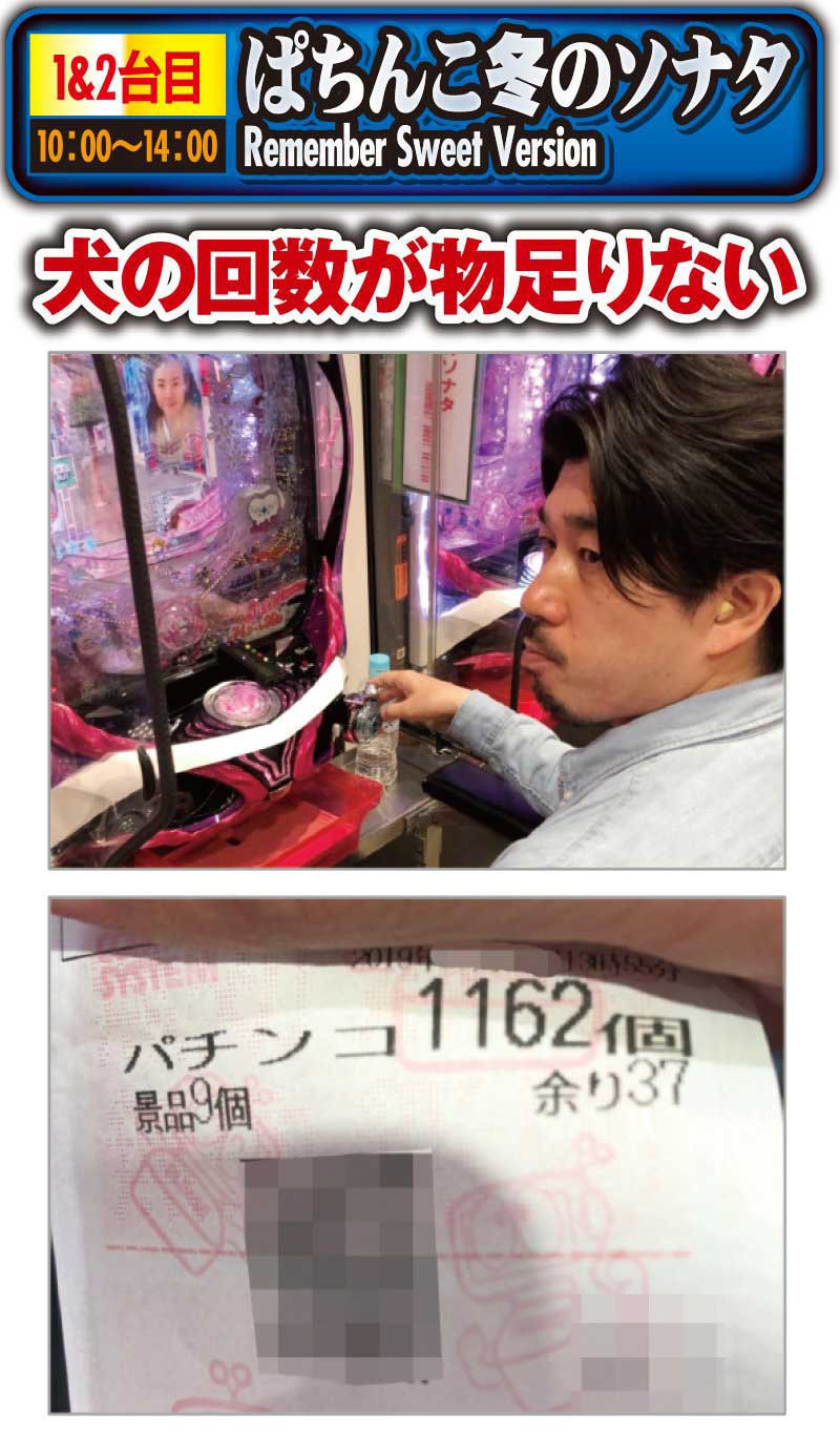 まずは冬ソナからスタート。ここに設定が入っていないとなると他も期待できない。2台目で何度かあたってくれて、確変中の犬首輪ハートのサンプルが採れたんだけど打つには足りないよね。