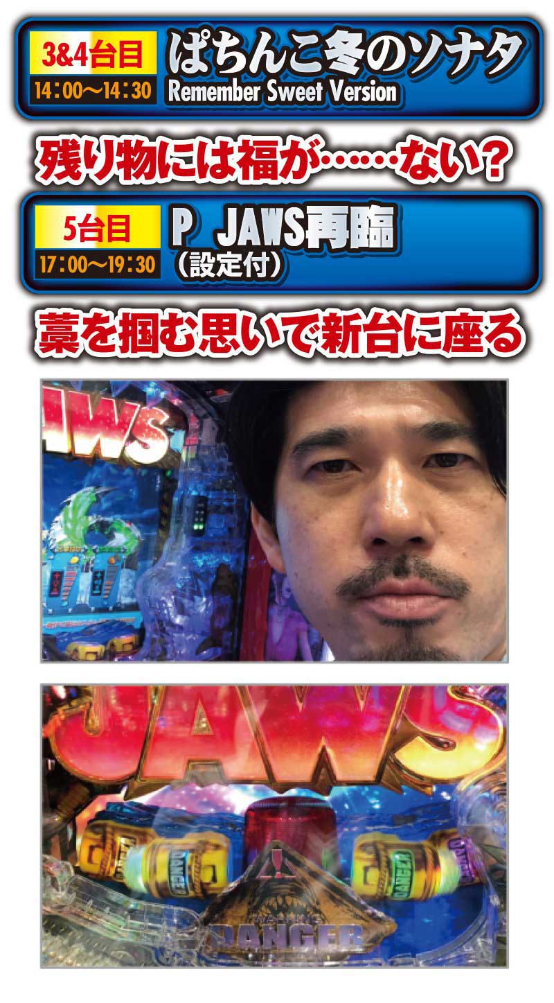 偵察から帰ってきたが打つ手なし。そんな中、この日新台で導入されたPジョーズが空き台に。こうなったら意地でも高設定を掴んでやる! そう思いながら稼働したが、どうやらこの台も無さそうだ。