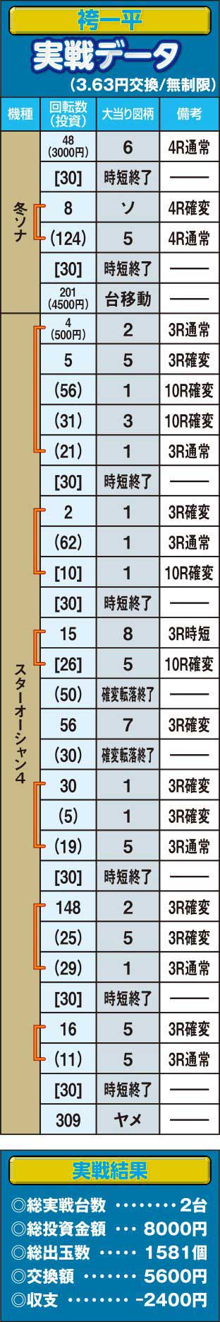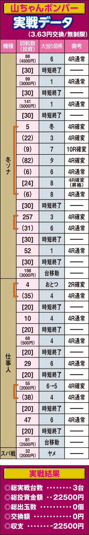 あれだけ頑張ったにも関わらず、無念の敗北。実戦終了と共に肩を落とす3人に前日の笑顔はない。だが、内容的には決して悪くはなかった様だ。高設定っぽい台を掴み、あと少しの時間があれば捲れていたはずの一平。回転率十分で高設定の匂いもあったが、結果が伴わなかったはじめ。展開に恵まれずに空回った山ちゃん。特に山ちゃんは疑心暗鬼に陥り普段なら追いかける冬ソナをヤメてしまい、心底悔しがっていた。