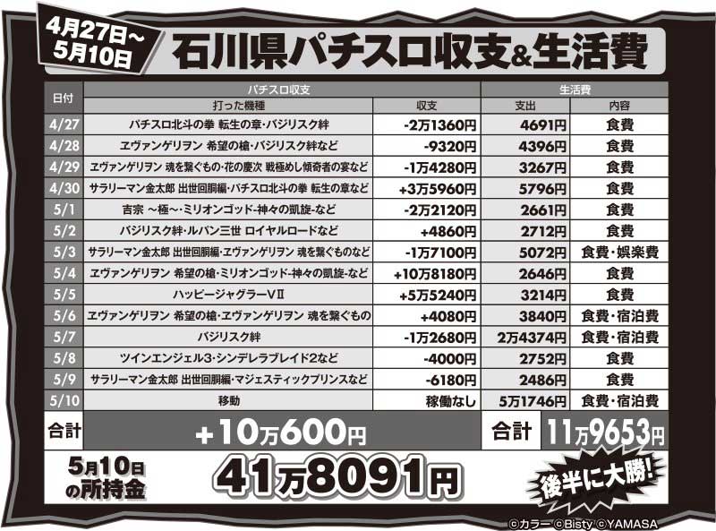 石川で立ち回ると、序盤からマイナス続き。GWの影響で稼働が上がり、台数をこなせず結果がついてきませんでした。