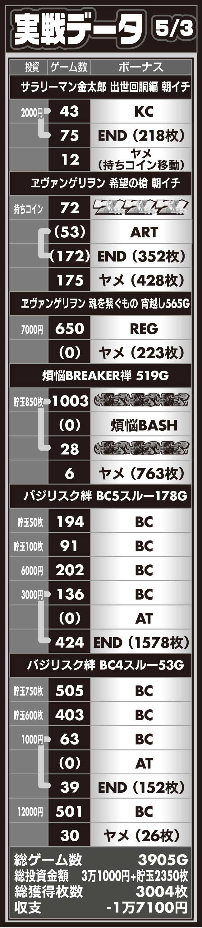 そんな中、迎えた滞在7日目。下記データは夕方までプラスだったのが、最後のバジリスク絆で大敗したもの。1日の収支が一気にマイナスになった日のデータです。負けが続いている中、やっと勝利できたと思っていたらマイナス終了。昨今のパチスロは稼働内容が良くても結果がついてこない事が多々あります。普段であれば特に気になりませんが、旅打ち中は別。期間やノルマがあるため、結果が出ないと精神的にキツくなります。