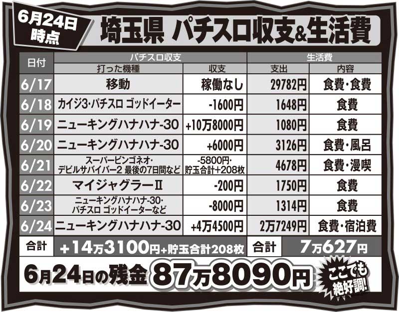 埼玉入りしてからは前半の稼働の流れを少し変えてみました。今までは旅打ちの常套手段…ハイエナでノルマプラスを稼ぎ出して余裕を持ってからは高設定狙い。しかし、群馬のときから感じるのはハイエナの収支の荒れ。これは現行機種を打つ上で避けては通れません。県前半に下ブレすると周りが見えなくなり高設定狙いのチャンスを見逃してしまう可能性があります。